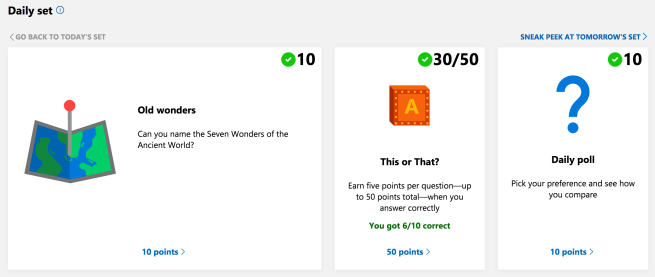 There are three primary ways to earn points. The first is by completing the Daily Set. Each day, a set of three activities awaits at the top of your Microsoft Rewards account dashboard. These include a daily search, a quiz, and a daily poll. Completing the Daily Set takes about two minutes, and will earn you anywhere from 30-70 points depending on the day. These sets also have an added bonus: for every few days that you consecutively complete them, you’ll earn up to 150 extra points.