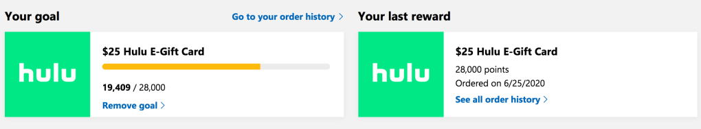 In the Microsoft Rewards store, 28,000 points will get you a $25 gift card to Hulu—good for just over four months of their ad-supported plan. I typically earn around 300 points per day, which means it takes me about three months to earn enough points to cover a four-month subscription—ensuring that I’ll always be able to cover the cost of my Hulu account.