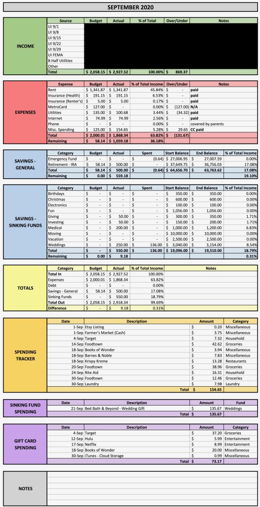 I no longer split up my remaining money into various categories because I’m mostly spending it on groceries and household items. I may begin splitting things back up once life becomes more normal and I start spending on restaurants and entertainment again, but, for now, this works. I spent $154.65 in September on variable expenses. This included $97.79 on groceries, $23.63 on household items (paper towels, tissues, etc.), $7.98 on laundry, and $25.25 on some books, an Etsy posting, and a visit to the new Krispy Kreme store in Times Square (it doesn’t take much to keep me happy!). I also used gift cards this month to pay for a grocery run at Target and to pay for the bulk of my purchase at Books of Wonder (this is an awesome independent bookstore specializing in children’s books in NYC…check them out online or if you’re ever in the city!).