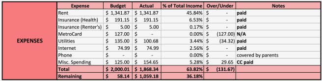 I spent $1,868.34 on my monthly expenses. This includes my rent at $1,341.87, my health insurance premium at $191.15, and my renter’s insurance premium at $5, all of which remain the same month after month. I continue to budget the full cost of an unlimited monthly MetroCard even though I’m not currently working or riding the subway very frequently, just for consistency’s sake. I didn’t factor the cost of the utilities/internet split into my budget, so these numbers represent the entire bill, not just my half: $100.68 for electricity and gas (this was lower than I had been expecting) and $74.99 for internet (this is the same every month). I may continue to do things this way, as I feel like this helped me reign in my spending even more and convinced me to send my roommate’s share directly into my savings. My parents graciously cover my phone bill so I spent no money there.