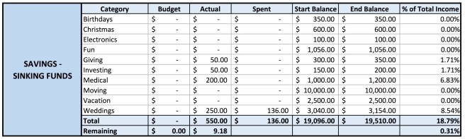 When I made my initial budget, I didn’t think I’d be contributing anything to my sinking funds this month. But because I saw that spike in my income, I was able to contribute $550: $50 to giving, $50 to investing, $200 to medical, and $250 to weddings (a portion of this was used to replenish the $135.67 I spent on a wedding gift this month).