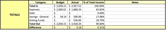 So, out of the $2,927.52 that I brought in, I spent $1,868.34 (about 64%) on my monthly expenses, and saved $1,050 (about 36%). Because I like nice, round numbers, this isn’t technically a zero-based budget, as I had $9.18 unaccounted for, which remains in my checking account as a buffer. While I generally like to save at least forty percent of my income, I know that circumstances are different right now, so I’m just grateful to be saving any amount! And, hey—it was more than I had originally budgeted, so I’ll take that as a win.