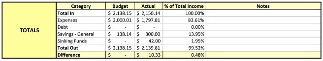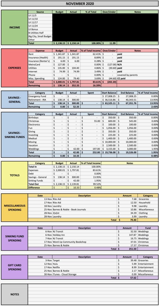 With an income of $2,150.14, expenses of $1,797.81, and $342 put towards savings, my savings rate for this month was just shy of 16%. While this isn’t ideal, it’s more than I had originally budgeted—and certainly better than 0%! This month was also a good reminder of why I utilize sinking funds: I was able to attend my sister’s wedding and get a head start on my Christmas shopping without once worrying about where that money would come from our how it would affect my budget.