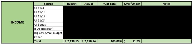 I spent $1,797.81 on regular expenses in November. I live in a two-bedroom apartment and split the costs of rent, utilities, and internet with my roommate. When budgeting my expenses, I account for only my half of the rent, but for the full amounts of the utility and internet bills; whatever my roommate owes me for those bills is included in my income.