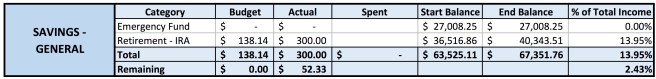 Because this was a lower income month, I didn’t have as much left over to save as I would have liked. I set aside $300 for my IRA this month, and, though this is more than the $138.14 I had initially budgeted, it’s less than the $500 that would have kept me on track to max out that account this year.