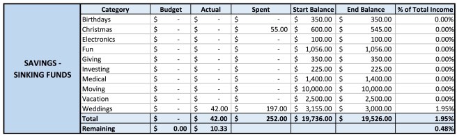 Even less went to my sinking funds this month; in fact, this was the first month of 2020 that I spent more from my sinking funds than I contributed. My contributions totaled $42 (to my weddings fund, to get it back to my goal balance of $3,000), while my spending totaled $252 ($197 spent on costs associated with attending my sister’s wedding, and $55 on Christmas gifts).