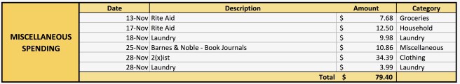 My miscellaneous spending—which I use to account for pretty much all of my variable monthly spending—was fairly light this month, at $79.40. This includes money spent on groceries, household items, and laundry, as well as anything discretionary (which, this month, came in the form of two Black Friday purchases).